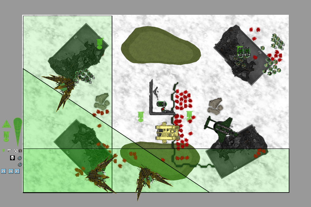 Salen 3 motos mas disparan a los cultistas, le hago muchas bajas ayudado por el Land Raider y se tiran cuerpo a tierra. El Tecnomarine y la moto que sobrevivieron acaban con una unidad de cultistas primero rebajandola a disparos y luego ganando el combate en la persecución. Se esconden para no ser objetivo de los aniquiladores. Con las motos que estan al lado de los aniquiladores disparo y asalto a los cultistas, huyen pero no le alcanzo. La Vendetta se cruza todo el tablero con la velocidad bloqueada y dispara a los Aniquiladores causando una baja. Le hago una herida con un fusión al Señor del Caos.