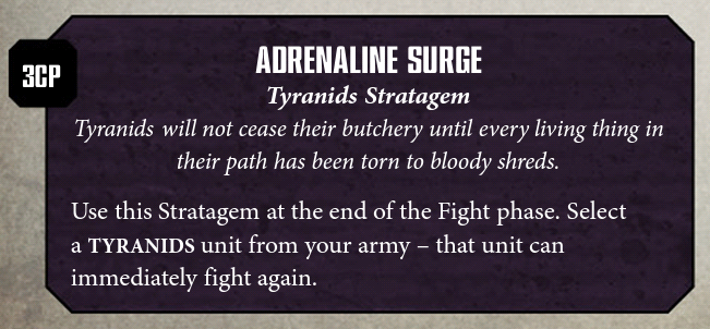 Si en el mismo ejemplo es el jugador tiranidos el que esta su turno en juego y vuelve al destruir al ik. Llega la fase final del combate y el ik no está en mesa por lo que no puedes usar la estratagema aumento de adrenalina y tras no hacer uso de tu estratagema, el jugador de iks puede usar la estratagema la hora más oscura. Sin que el jugador tiranidos pueda usar su estratagema de volver a combatir.