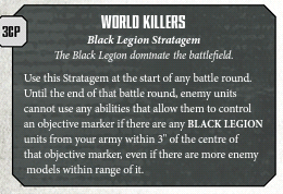 ResponderEliminarMerciless Fighters funciona al reves de como comentas. La unidad de Black Legion tiene que tener más miniaturas que la unidad enemiga. Aun asi, esta estratagema es buenisima.